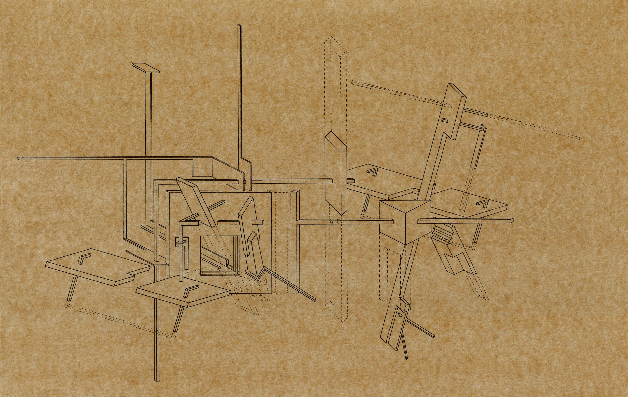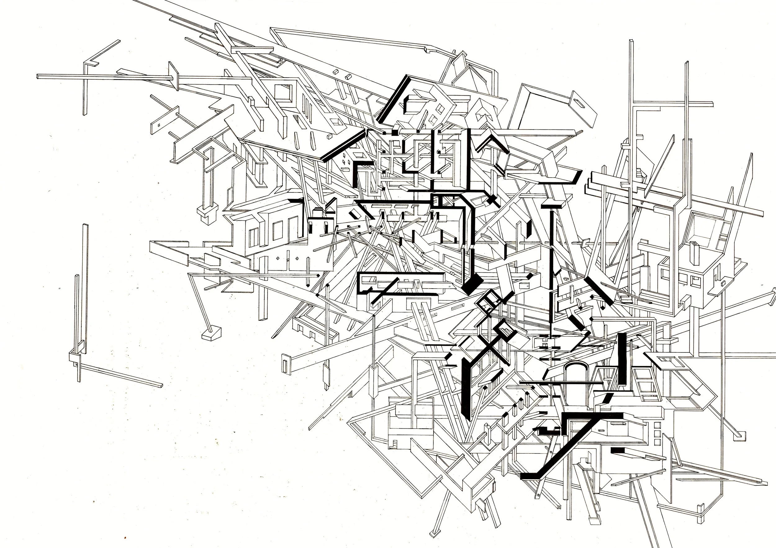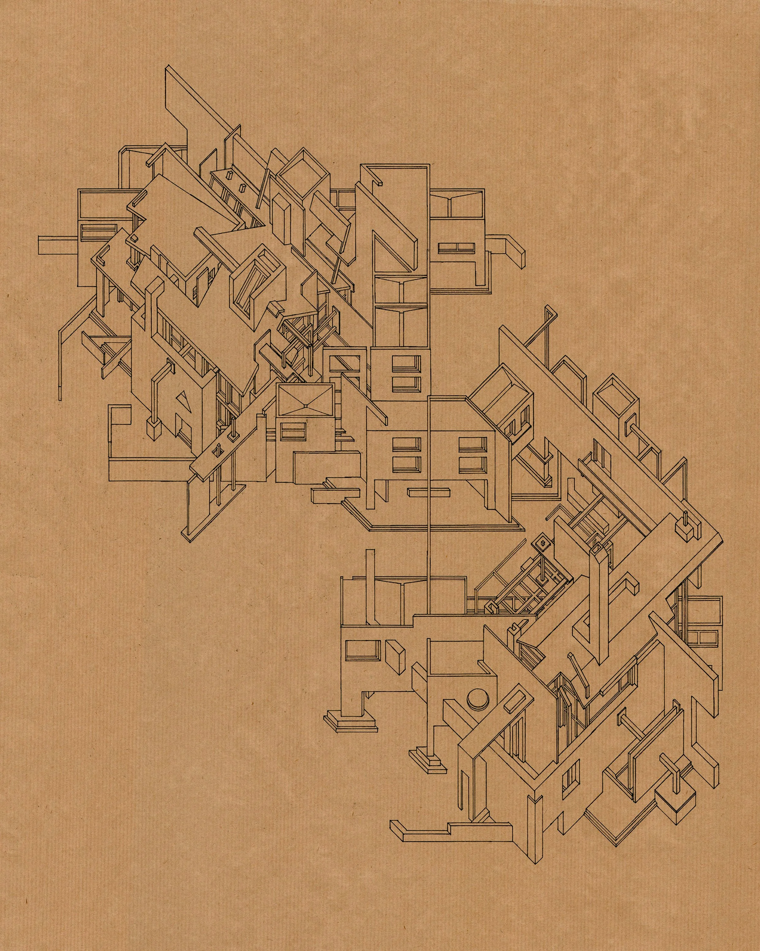 In ‘Pataphysical practice, determining when to stop drawing is never clear, creating a state of constant tension and flux. In response to this uncertainty, Brown explores the concepts of geometric restriction and restraint. Unlike many previous studies, the drawing is comprised of a small number of projections that suggest a fragment of something larger. These volumetric projections are positioned at various angles of perception, striving to avoid the constraints of gravity and foundation. Unlike studies such as Quirinale Palace, Brown is not intended to explore the process of material binding and accepts conditions of tectonic stasis. This approach allows the drawing to diverge from The Dialectical Computer studies and serve as a catalyst for a new series of explorations.