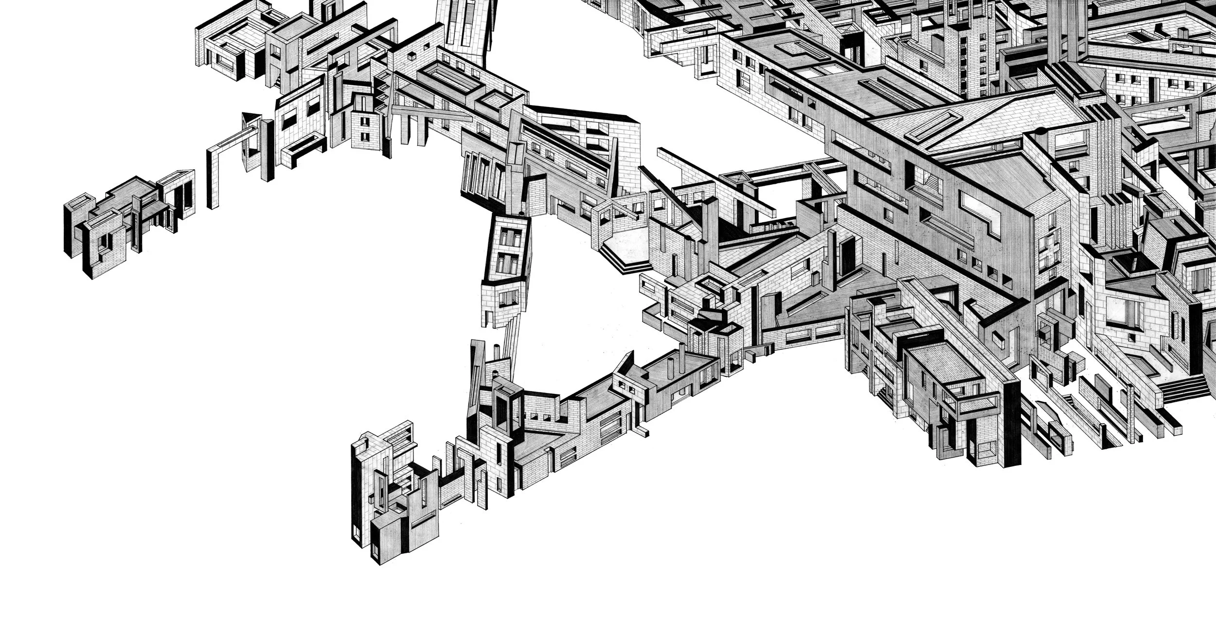 The drawing interrogates how previous studies in the research translate into more delineated or tangible architectural projections. To construct the morphology of Plan, plates from the Autonomous series were collaged and overlaid. A crucial compositional shift that happened in this process was that only the solid black in the Autonomous drawings was extracted, and the lines that sat within the frames were removed. Through the collaging/stitching process compositional/spatial configuration emerged. In dialogue with LOCUS, the resulting composition acts as a morphology form which to discover and extract space. Through this action, an inhabitable city block emerges through the dialogue between solid and void, suggesting a more grounded architectural configuration.