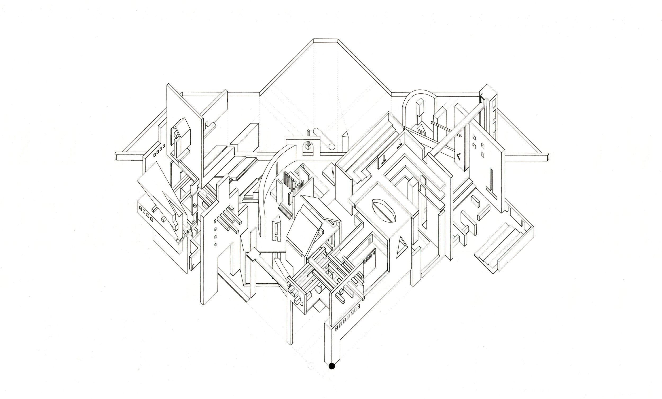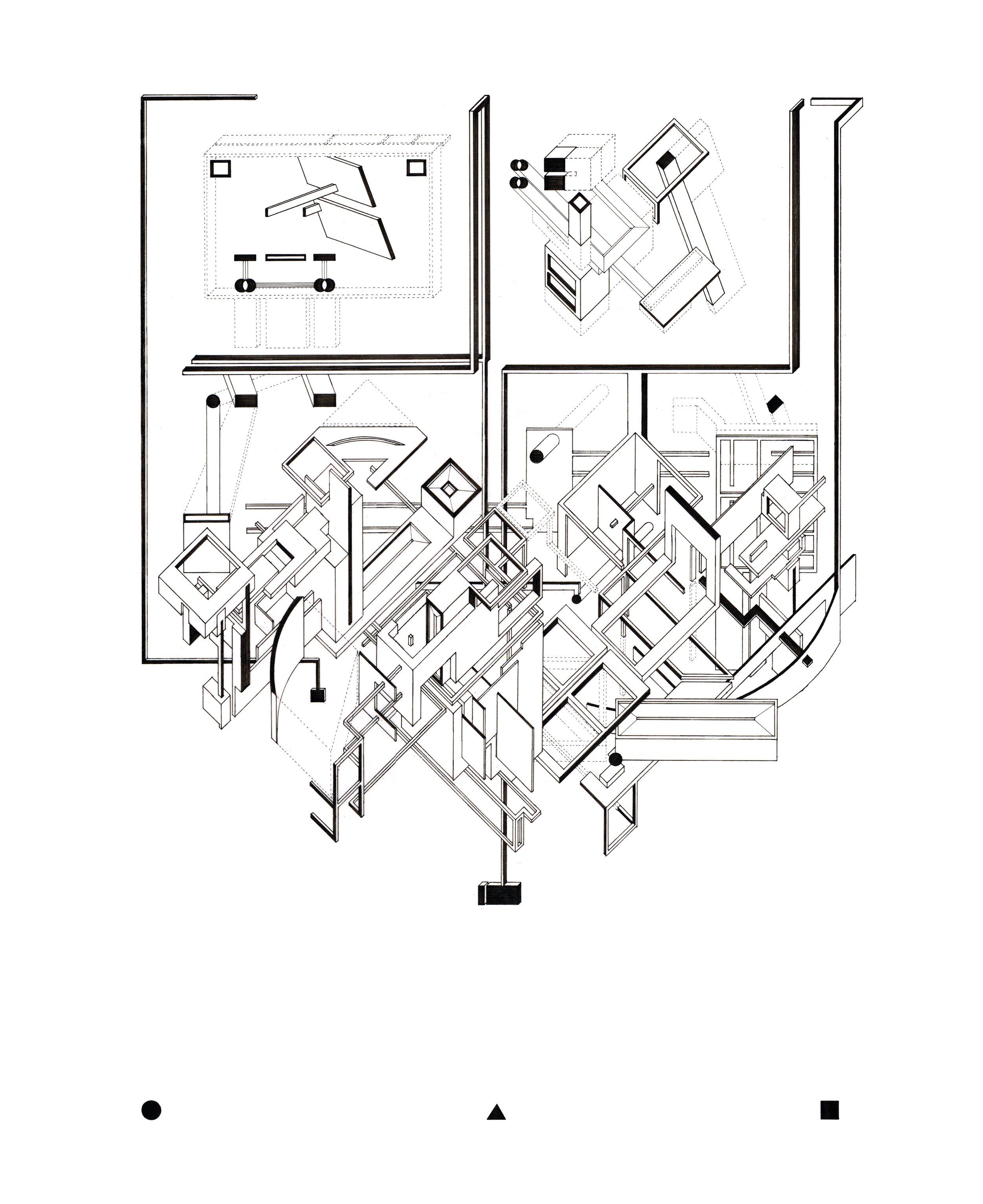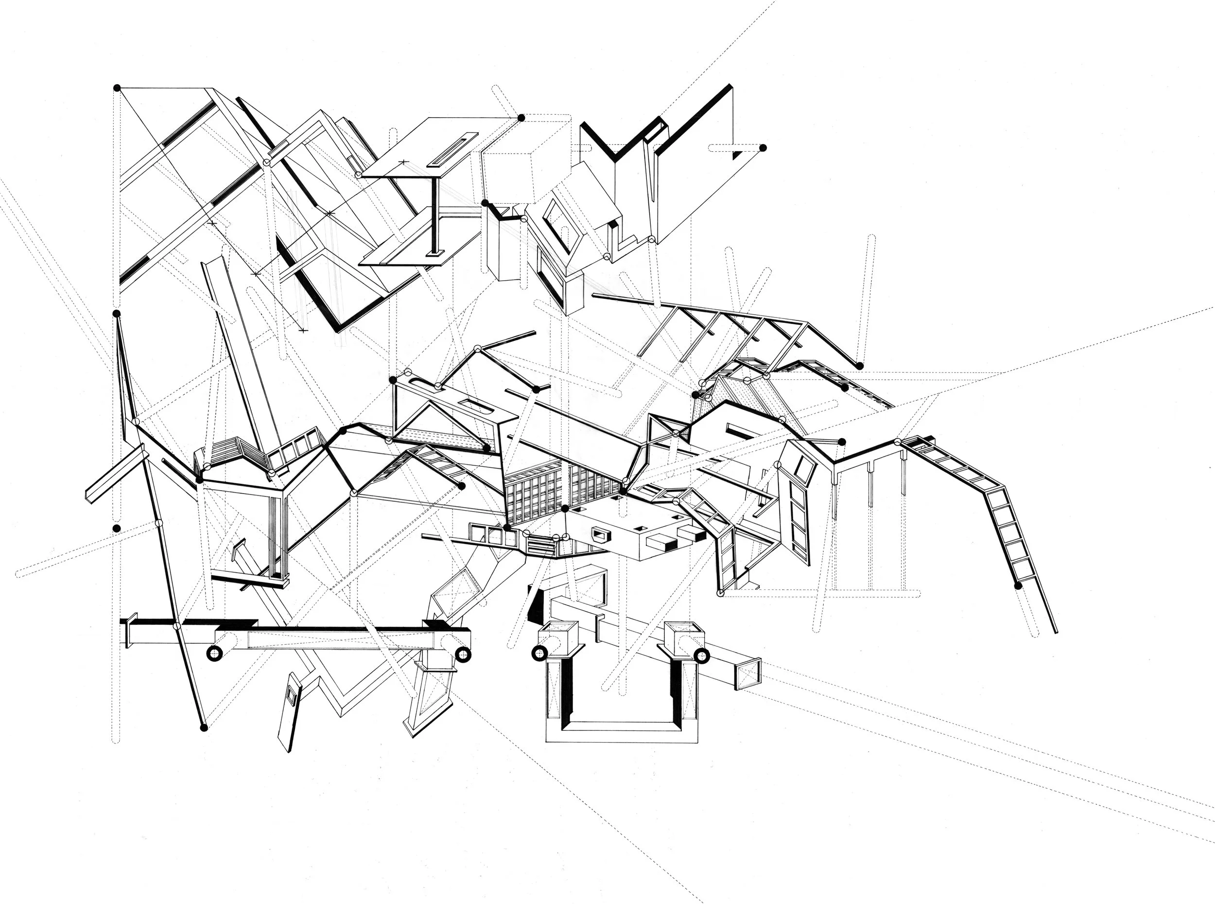 Through this process, a series of explicit geometric fragments emerged, translating the signs and symbols of the script into a space of tectonic projection. At times, such as the dotted lines, the translations are visual mappings of temporal transitions and spatial rotations. Others, such as the more recognisable structural elements, are mappings of spatial sound rhythms. Whatever the case may be, Survey raises the question whether the ‘Pataphysical practices' resistance in using an external existing condition as a compositional and ocular catalyst is of any relevance. For instance, contrary to the desire for 'pure' invention is the inconvenient reality that many drawings produced up to this point, such as LOCUS, Trip, Chimney, Map, and Plan, all start with external elements to inform and trigger the resulting configurations. A starting point may be a reflection on human regret, or perhaps it be a formal element taken from an external condition; their presence does not limit the practice but helps it emerge. In the ‘Pataphysical practice, these things do not become oracles or blueprints, but are tools when and if needed, open for free (mis)interpretation. In The Dialectical Computer study, the notion of external input is the central component for the ‘Pataphysical moment. Consequently, the translation process during the making of Survey confronts the previous desire to invent without an external compositional informer, and is (mis)directed and (mis)guided by the interpretations offered by the external script.