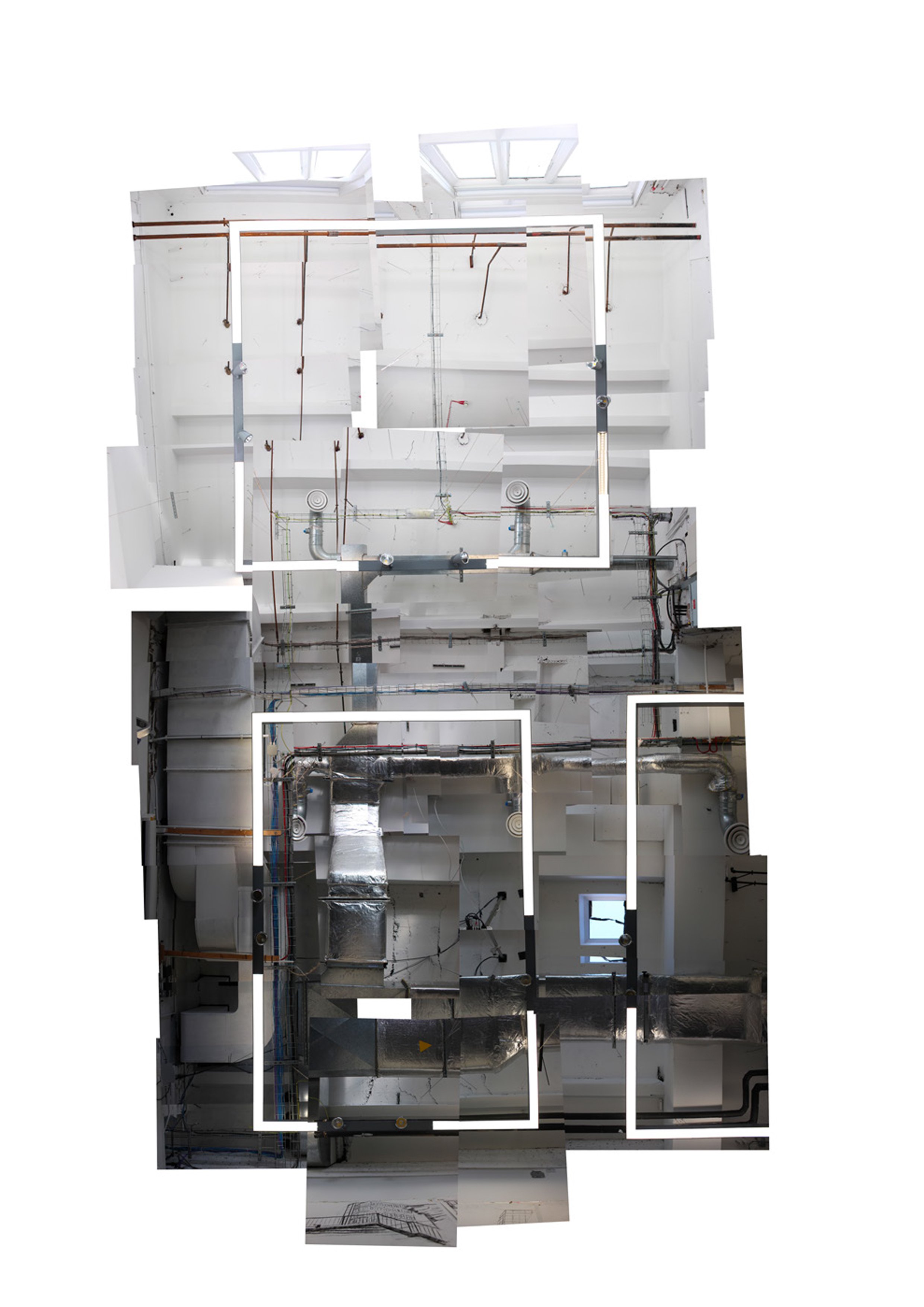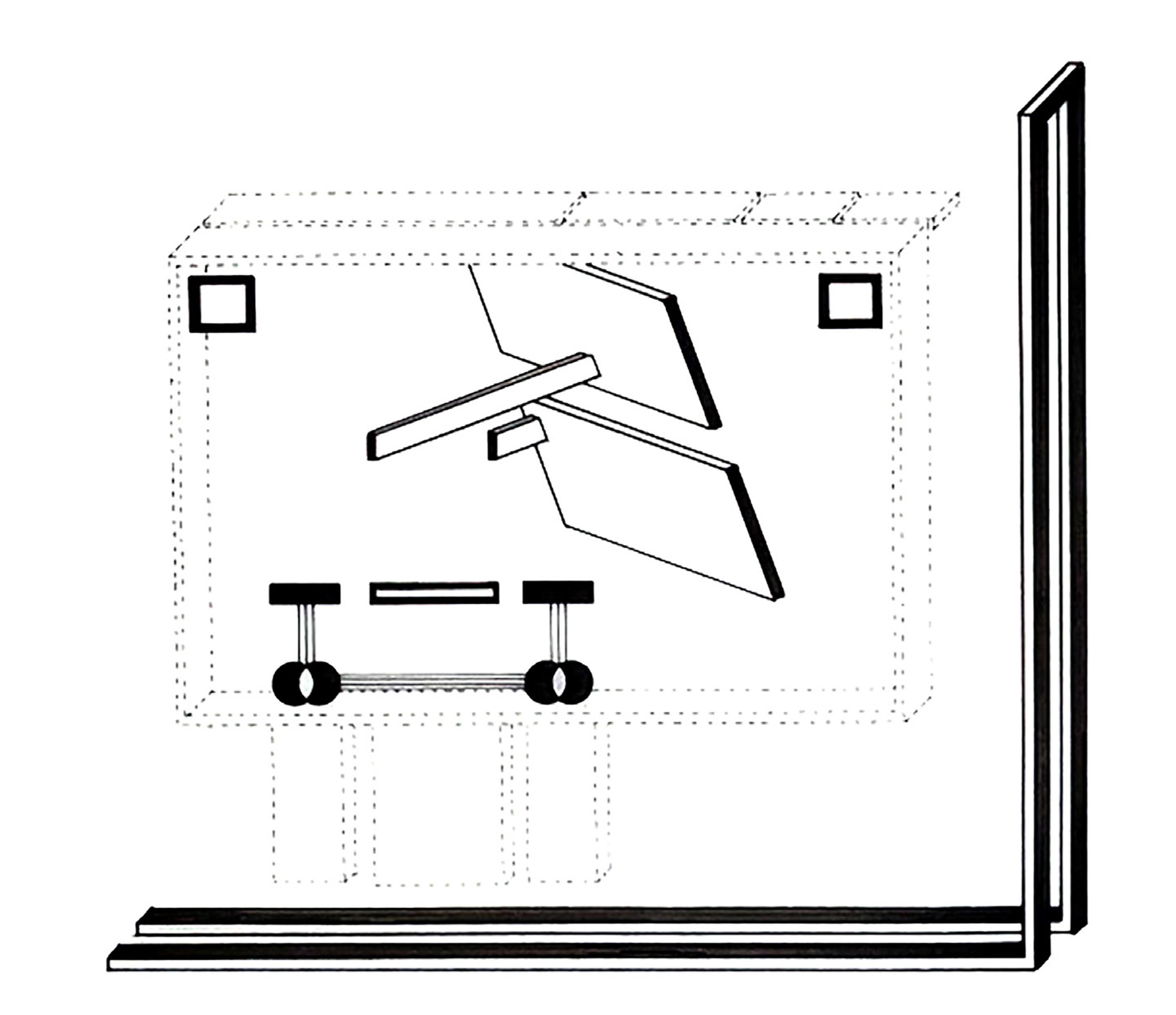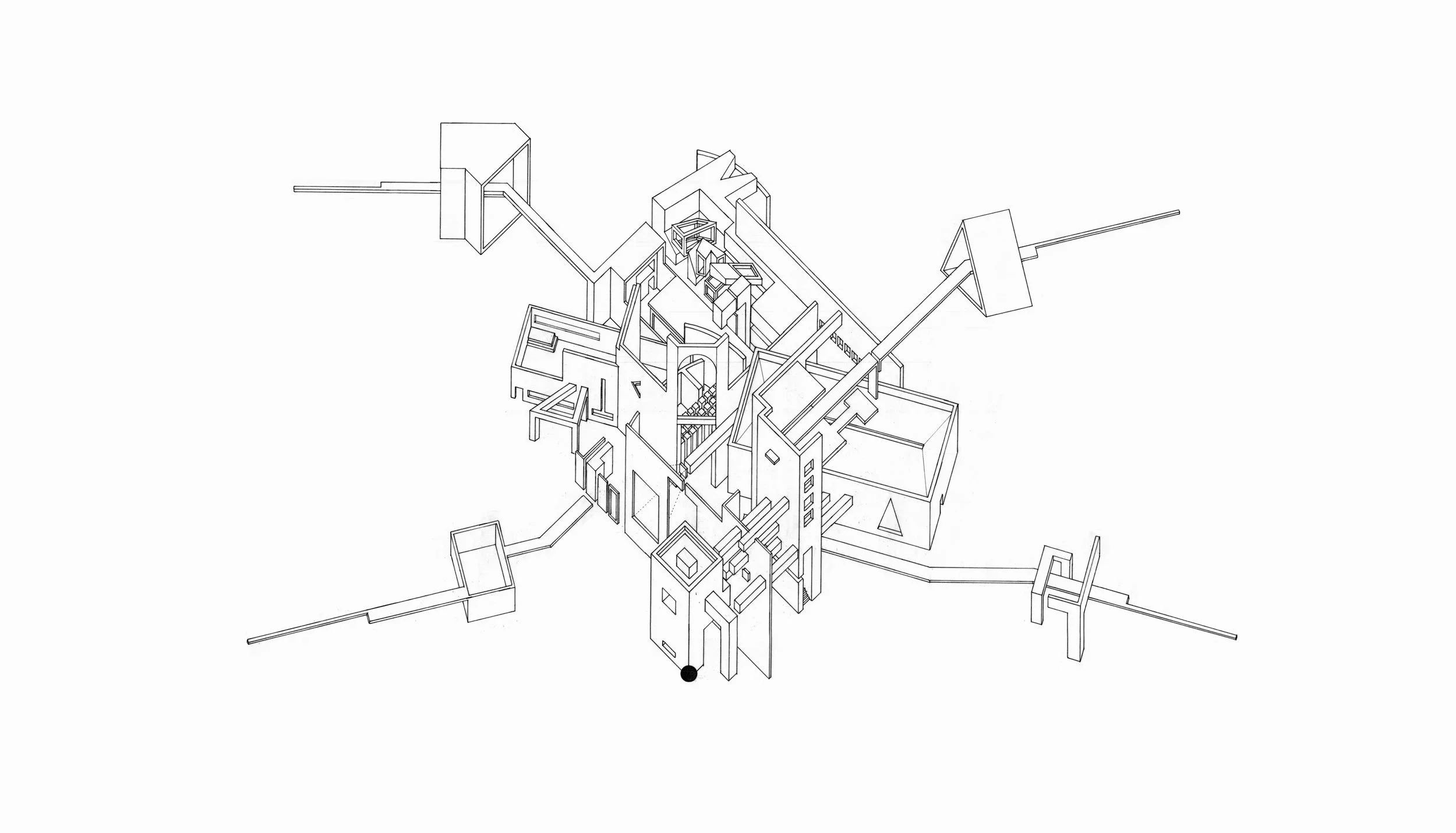 Through this process, a series of explicit geometric fragments emerged, translating the signs and symbols of the script into a space of tectonic projection. At times, such as the dotted lines, the translations are visual mappings of temporal transitions and spatial rotations. Others, such as the more recognisable structural elements, are mappings of spatial sound rhythms. Whatever the case may be, Survey raises the question whether the ‘Pataphysical practices' resistance in using an external existing condition as a compositional and ocular catalyst is of any relevance. For instance, contrary to the desire for 'pure' invention is the inconvenient reality that many drawings produced up to this point, such as LOCUS, Trip, Chimney, Map, and Plan, all start with external elements to inform and trigger the resulting configurations. A starting point may be a reflection on human regret, or perhaps it be a formal element taken from an external condition; their presence does not limit the practice but helps it emerge. In the ‘Pataphysical practice, these things do not become oracles or blueprints, but are tools when and if needed, open for free (mis)interpretation. In The Dialectical Computer study, the notion of external input is the central component for the ‘Pataphysical moment. Consequently, the translation process during the making of Survey confronts the previous desire to invent without an external compositional informer, and is (mis)directed and (mis)guided by the interpretations offered by the external script.