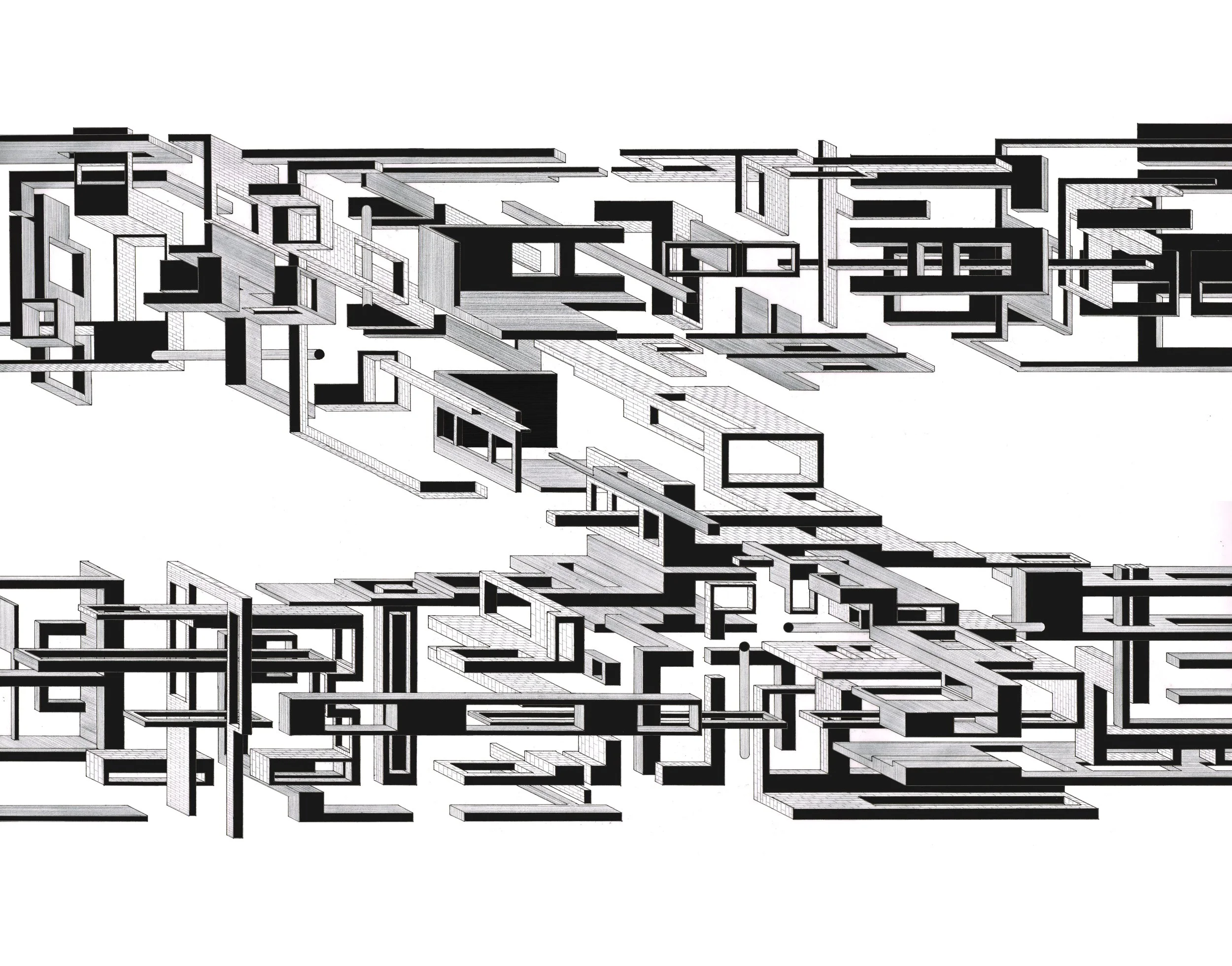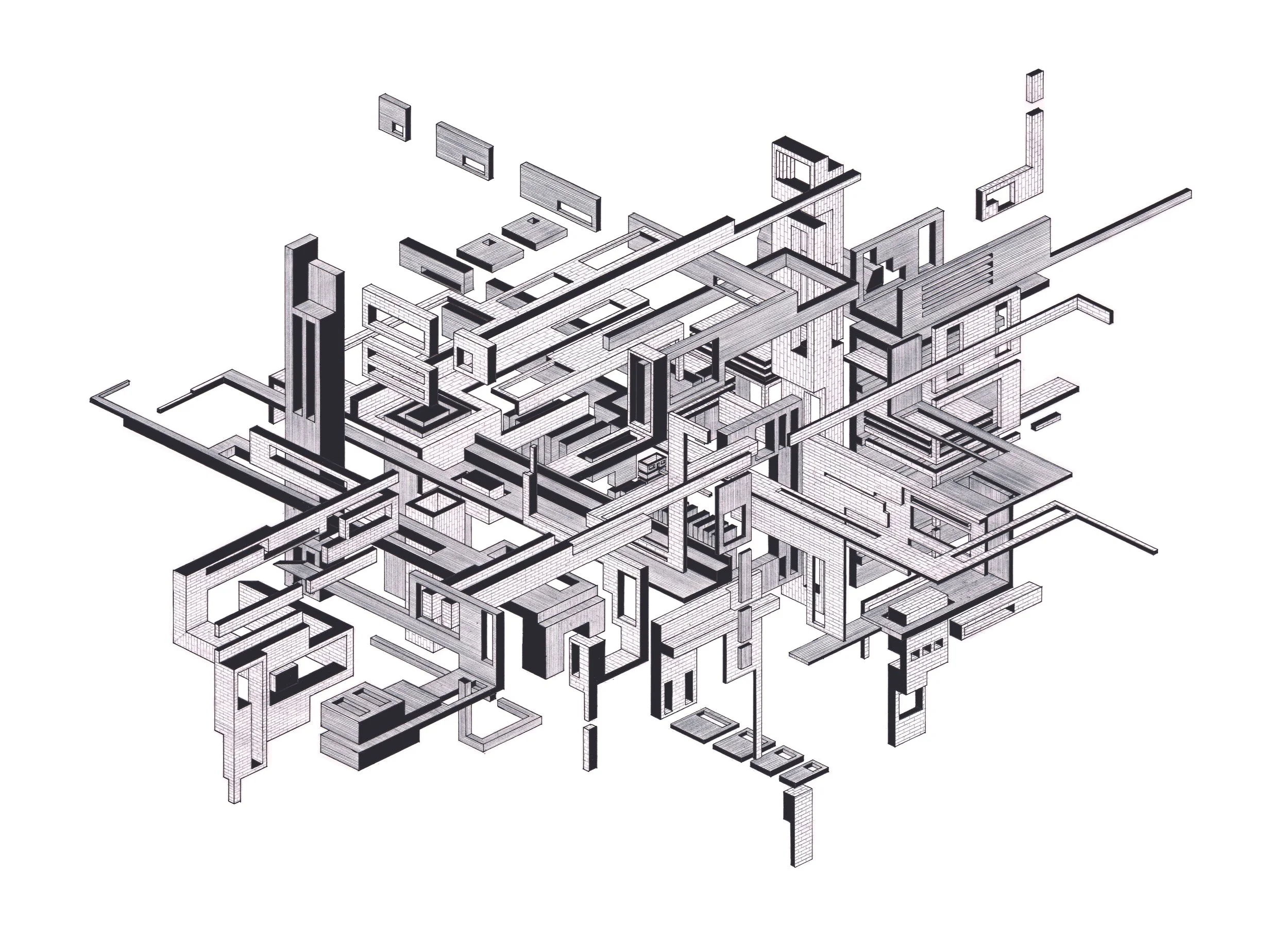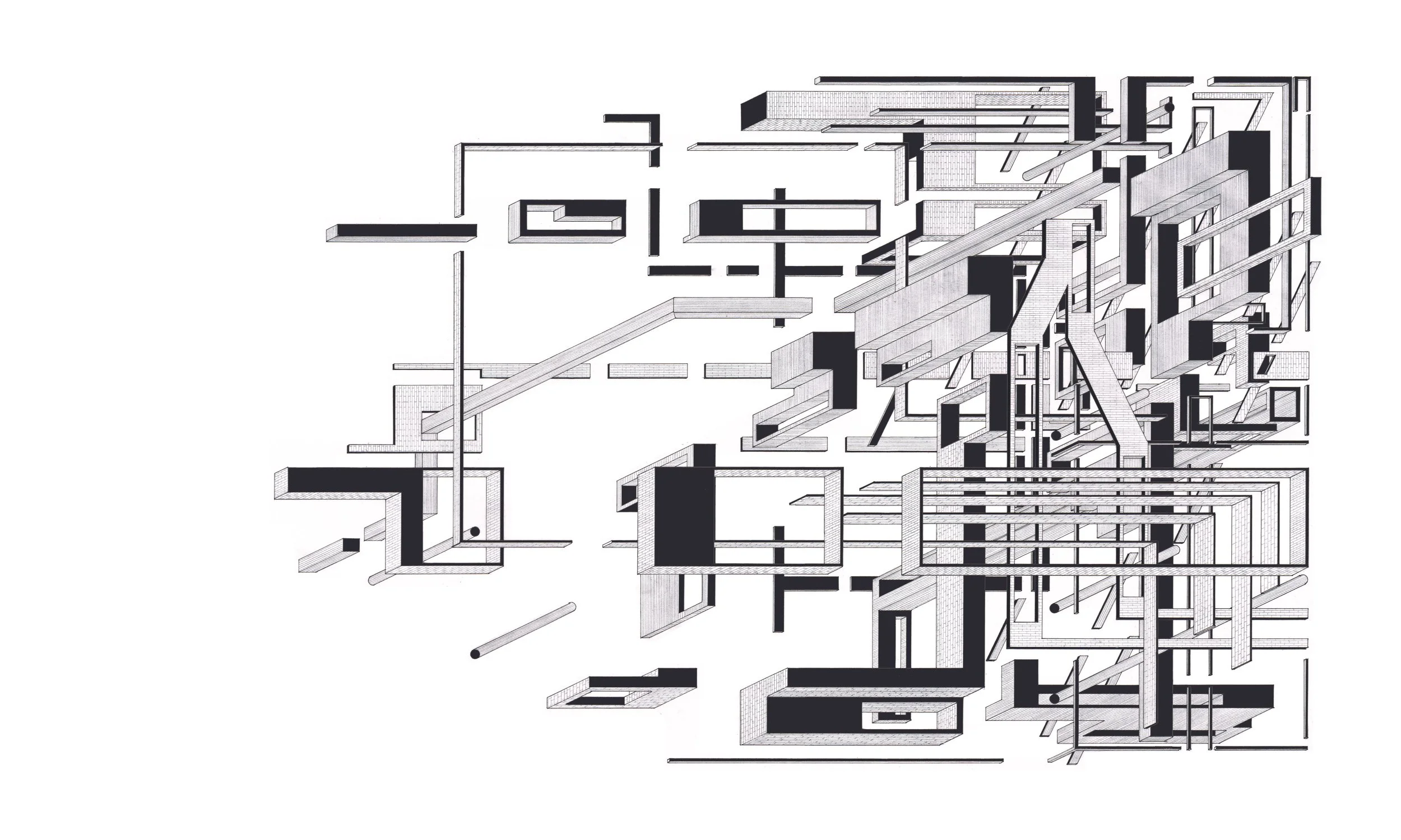 In direct dialogue with the removal of the frame, Chimney does not entirely decouple from the need for a datum or trigger point for the projections to emerge from. This is because the drawing uses the existing architectural element of a terrace house chimney as its starting point. Like many pieces of built architecture, the drawing is an exploration into the chimney as an anchor point for architectural invention and experience. The projections that surround the chimney, embedding it within a framework of geometric entities, sit in a spatial stasis, unsure of where to go. Through this uncertainty, the entities avoid projecting beyond the limits of the paper, creating a condition in which the right-hand side of the drawing manifests an edge condition/frame. The top and bottom of the drawing repeat this limitation of consciousness. Does this originate from an adoration of composition? Or a fear of the papers edge?