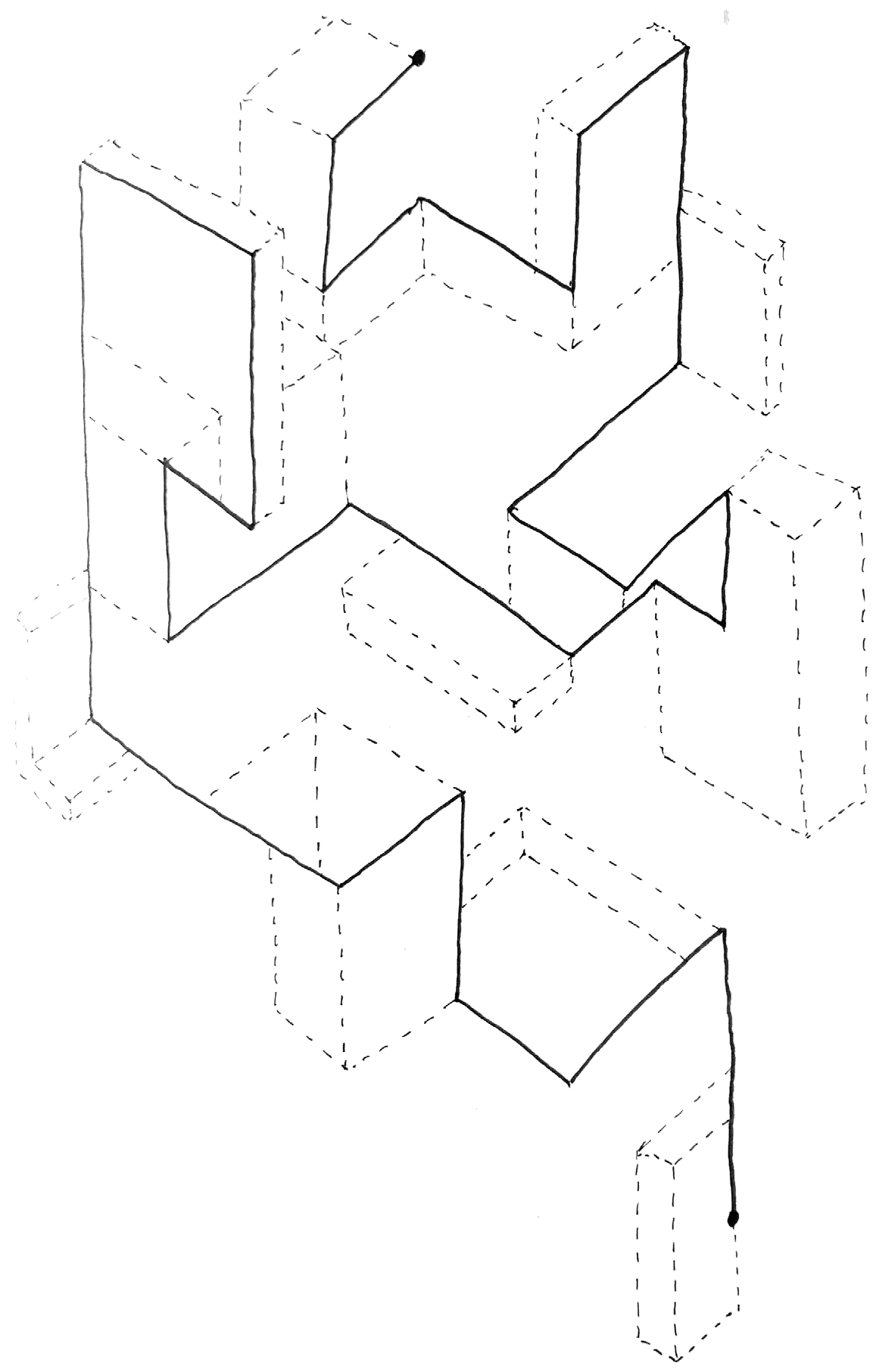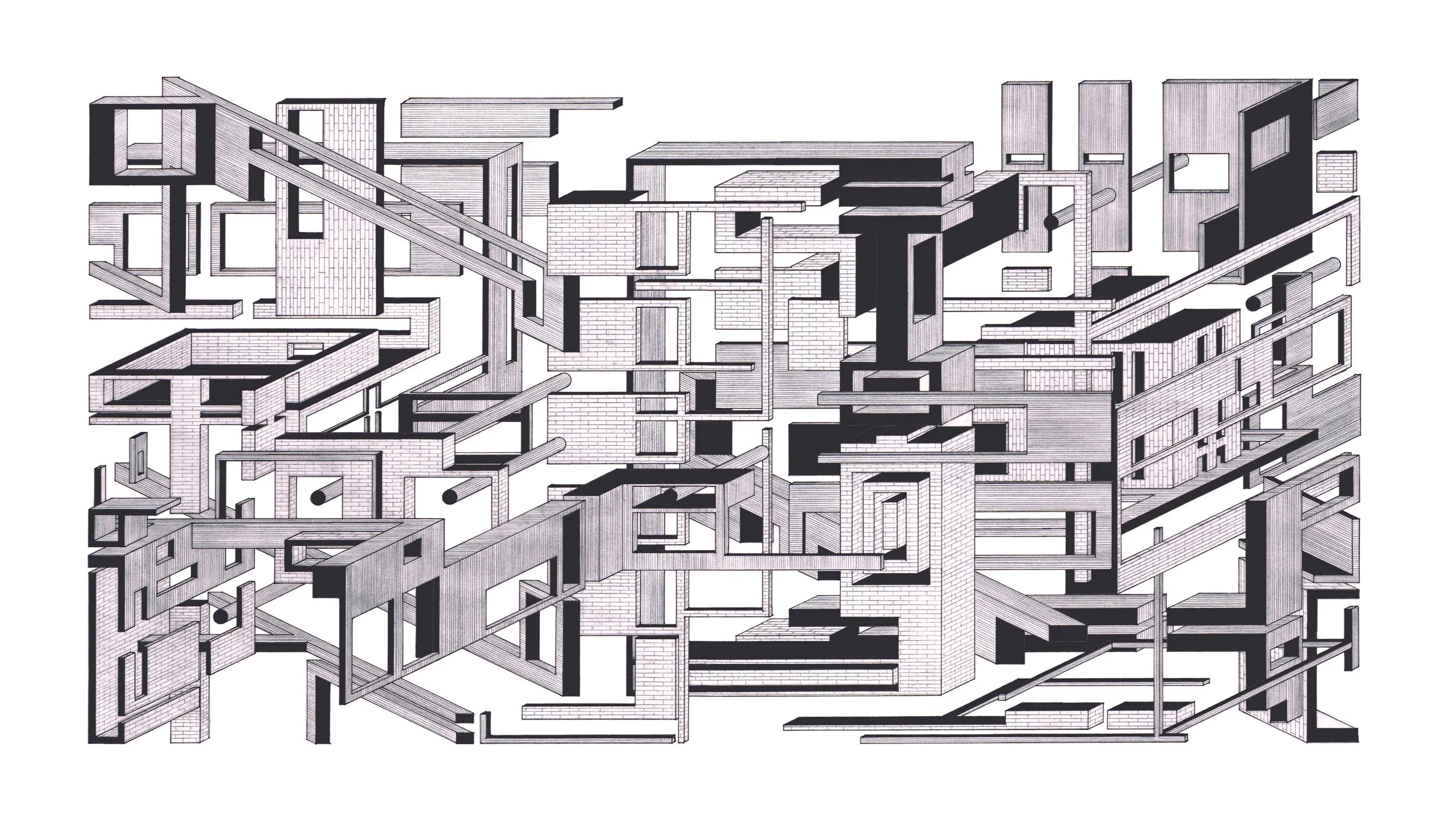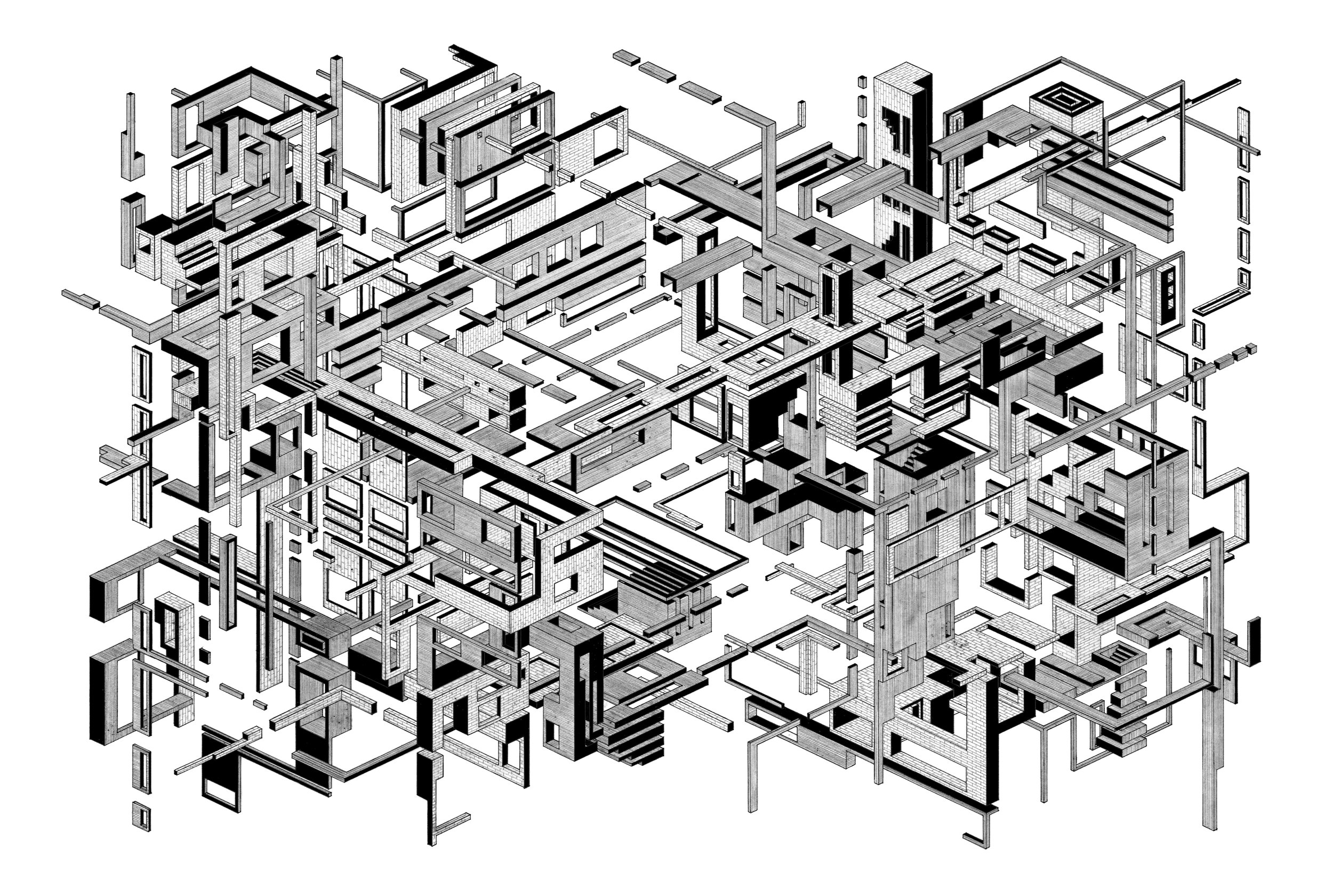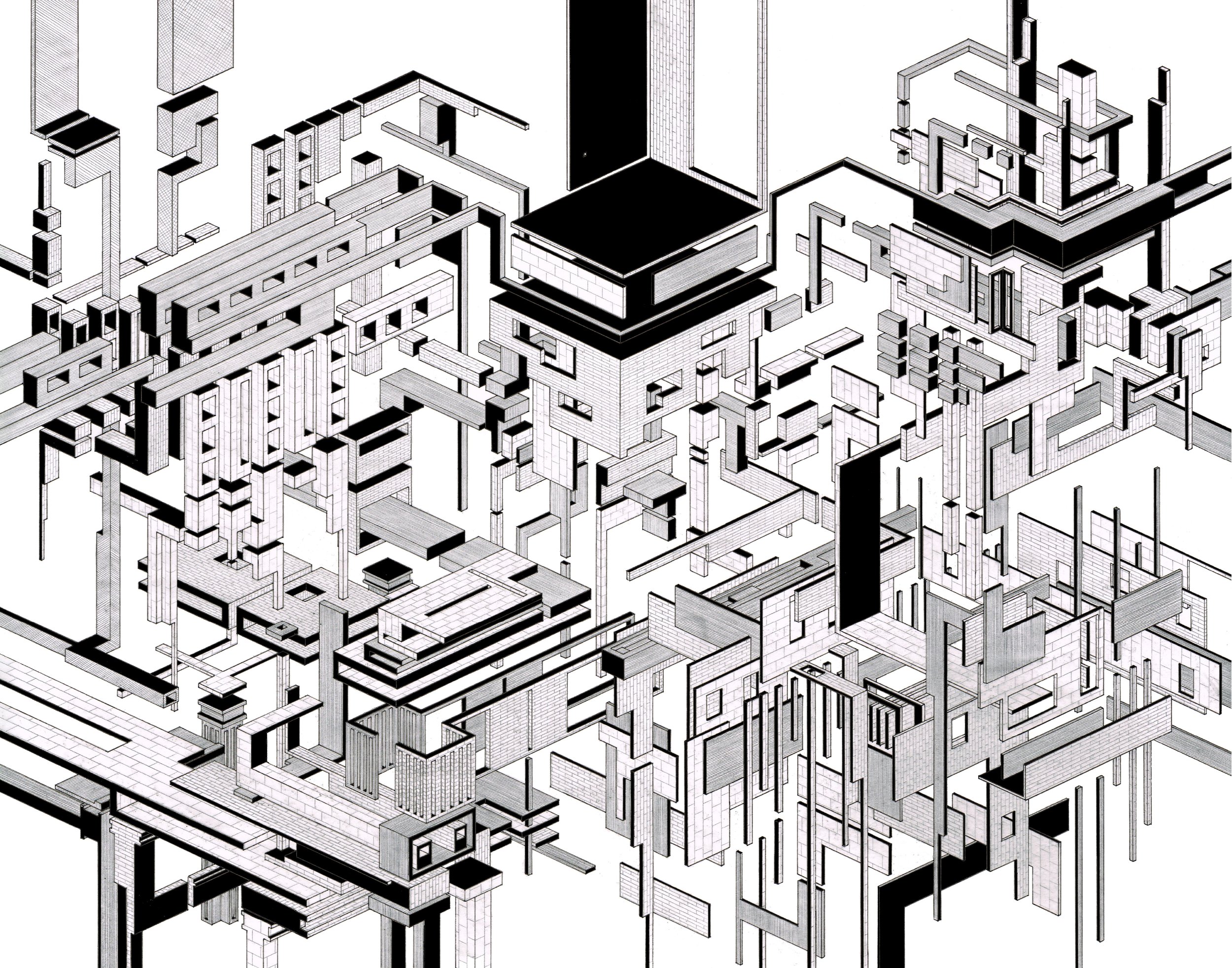 In direct dialogue with the removal of the frame, Chimney does not entirely decouple from the need for a datum or trigger point for the projections to emerge from. This is because the drawing uses the existing architectural element of a terrace house chimney as its starting point. Like many pieces of built architecture, the drawing is an exploration into the chimney as an anchor point for architectural invention and experience. The projections that surround the chimney, embedding it within a framework of geometric entities, sit in a spatial stasis, unsure of where to go. Through this uncertainty, the entities avoid projecting beyond the limits of the paper, creating a condition in which the right-hand side of the drawing manifests an edge condition/frame. The top and bottom of the drawing repeat this limitation of consciousness. Does this originate from an adoration of composition? Or a fear of the papers edge?