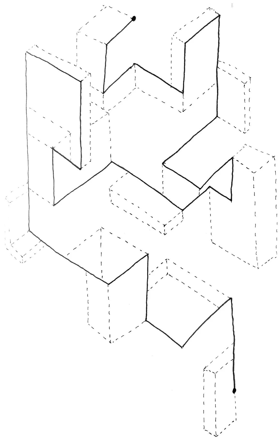 In direct dialogue with the removal of the frame, Chimney does not entirely decouple from the need for a datum or trigger point for the projections to emerge from. This is because the drawing uses the existing architectural element of a terrace house chimney as its starting point. Like many pieces of built architecture, the drawing is an exploration into the chimney as an anchor point for architectural invention and experience. The projections that surround the chimney, embedding it within a framework of geometric entities, sit in a spatial stasis, unsure of where to go. Through this uncertainty, the entities avoid projecting beyond the limits of the paper, creating a condition in which the right-hand side of the drawing manifests an edge condition/frame. The top and bottom of the drawing repeat this limitation of consciousness. Does this originate from an adoration of composition? Or a fear of the papers edge?